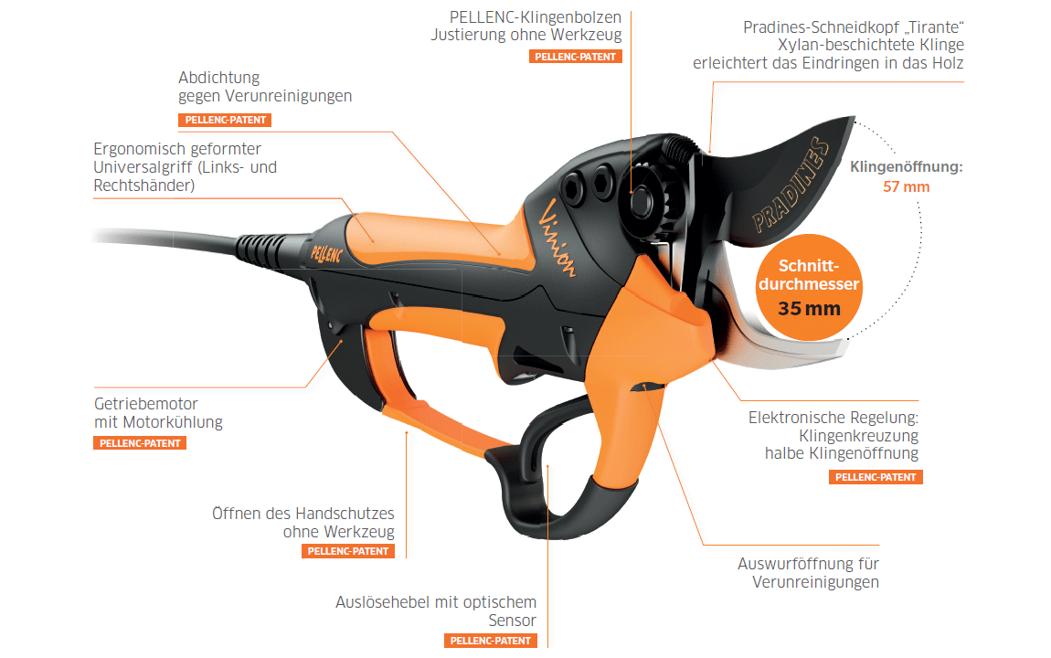 Mit der VINION verfügt PELLENC über die innovativste Rebschere der Branche. Die revolutionäre Schneidtechnologie der VINION erfüllt höchste Ansprüche hinsichtlich Gewicht, Ergonomie, Handhabung und Präzision. Auf unterschiedlichste Anforderungen ausgelegt, kann die Rebschere sowohl mit dem leichten und kompakten Taschenakku 150 als auch mit dem Akku 250 eingesetzt werden, der über einen Doppelanschluss für den wechselnden Einsatz von zwei PELLENC-Geräten verfügt.