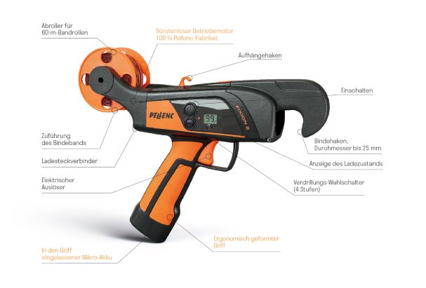 In das innovative Akku-Bindegerät FIXION 2 haben wir all unser Know-how aus 20 Jahren Entwicklung und Herstellung von von elektronischen Bindegeräten gepackt – und damit ein Gerät entwickelt, das optimal auf die Anforderungen und Wünsche der Anwender ausgelegt ist. Dank des integrierten Akkus, ergonomisch geformten Griffs und umfassenden Angebots an PELLENC-Bindebändern profitieren Sie mit Fixion 2 von einer nie dagewesenen Bewegungsfreiheit, Produktivität und Arbeitsgeschwindigkeit.